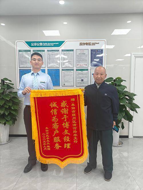 这面锦旗不仅代表了客户的衷心感谢热丰网,更是对农业银行“客户至上”服务理念的最佳印证。农业银行阜阳分行始终致力于将专业服务与人性关怀相结合,此次事件充分展现了其作为国有大行,守护客户资金安全的责任与担当。(王敏 文/图)