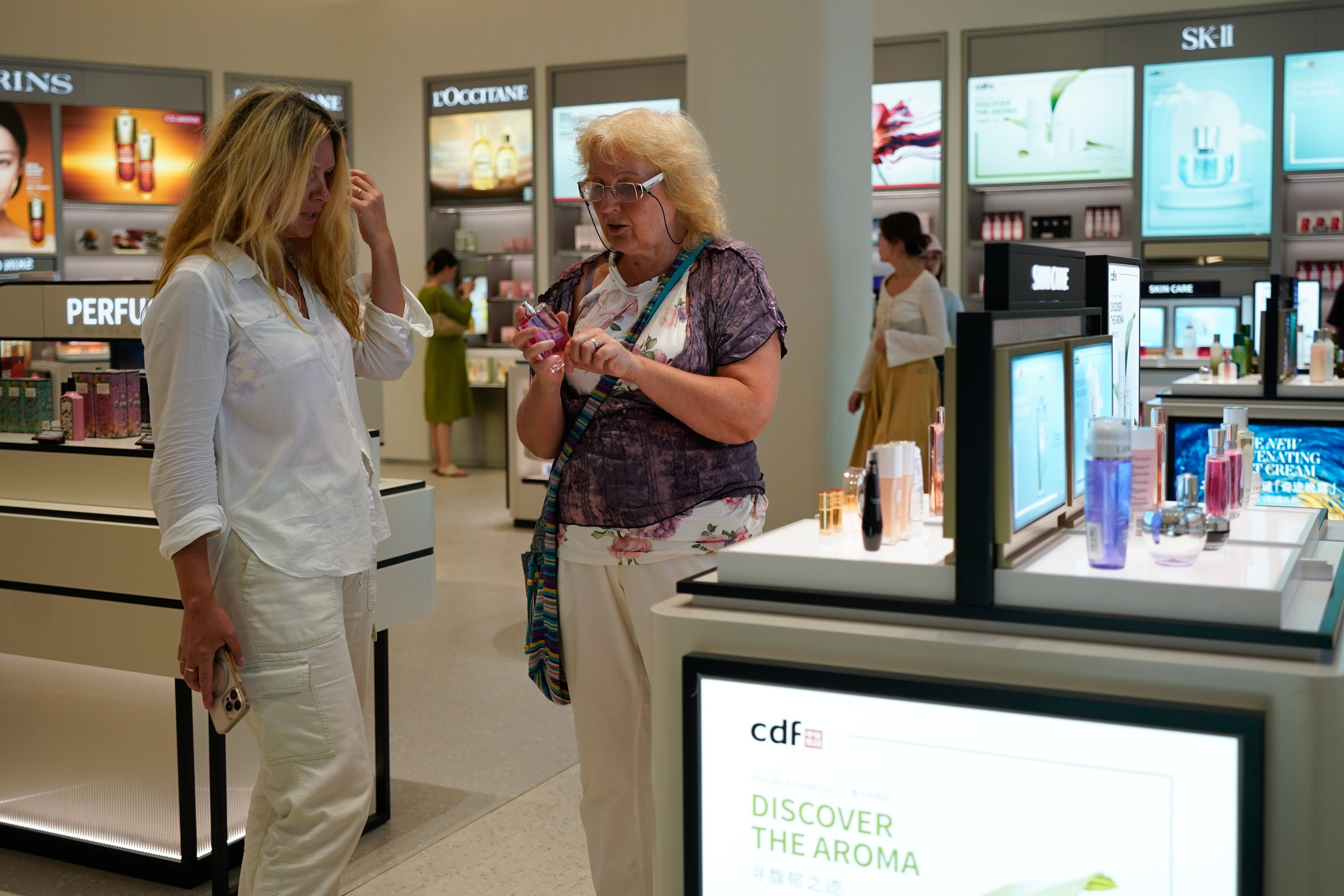 9月25日,游客在成都市内免税店免税商品区域选购香水。新华社记者 胥冰洁 摄来自澳大利亚的游客康纳买了不少东西,他告诉记者:“我领到了100元人民币的优惠券,这里商品很丰富,价格合适,我买了一些香水,还买了些化妆品带给家人,我感觉在这里购物很方便、很开心。”